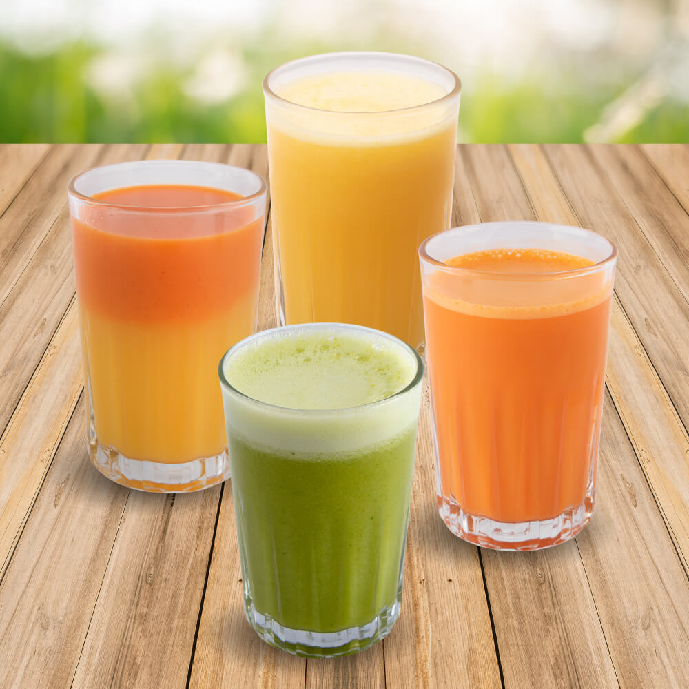 300 ml. de jugo natural de naranja, zanahoria, zanahoria con naranja o verde (jugo de naranja, apio, piña y perejil).