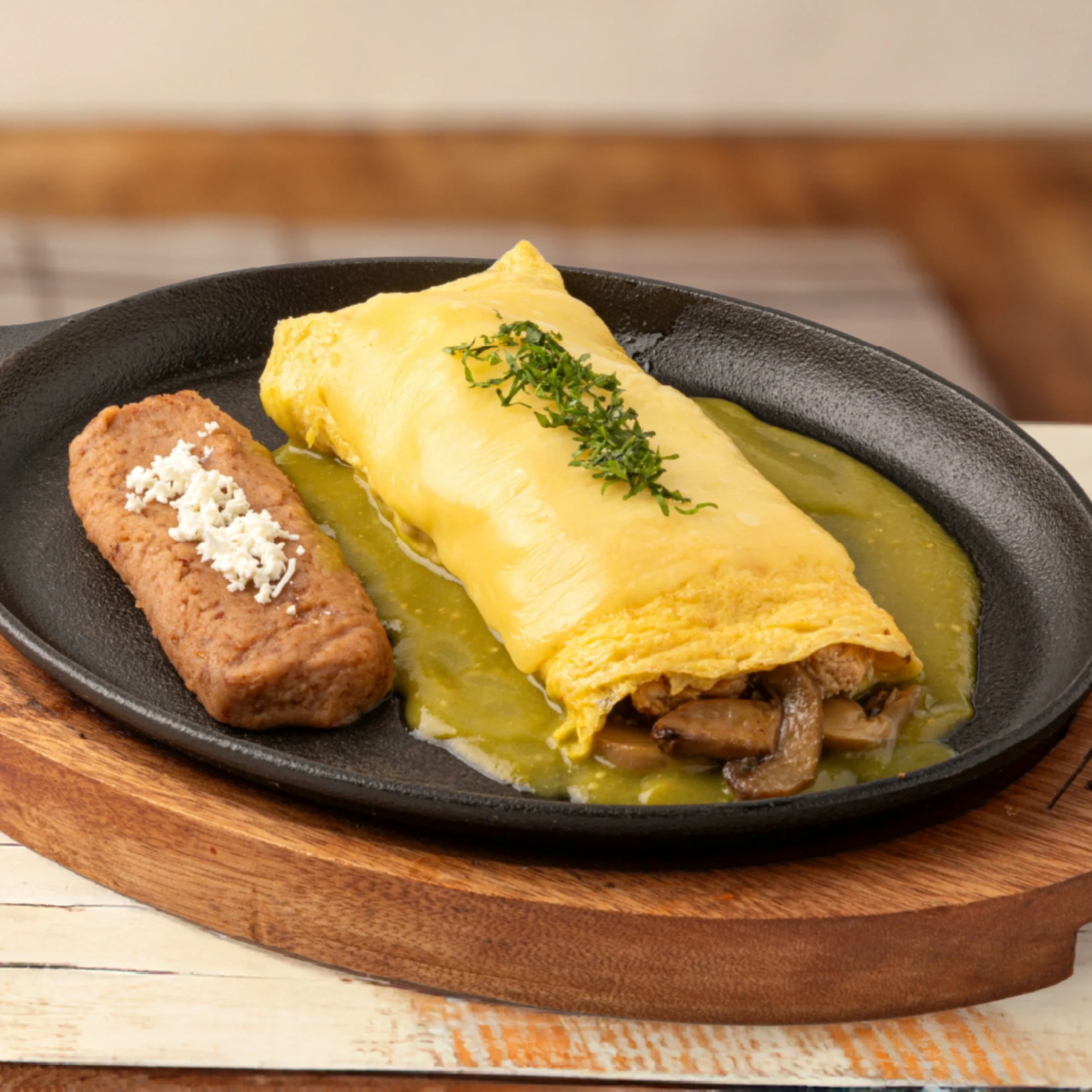 2 pzas. de huevos. Relleno con 100 g. de pechuga de pollo y champiñones.