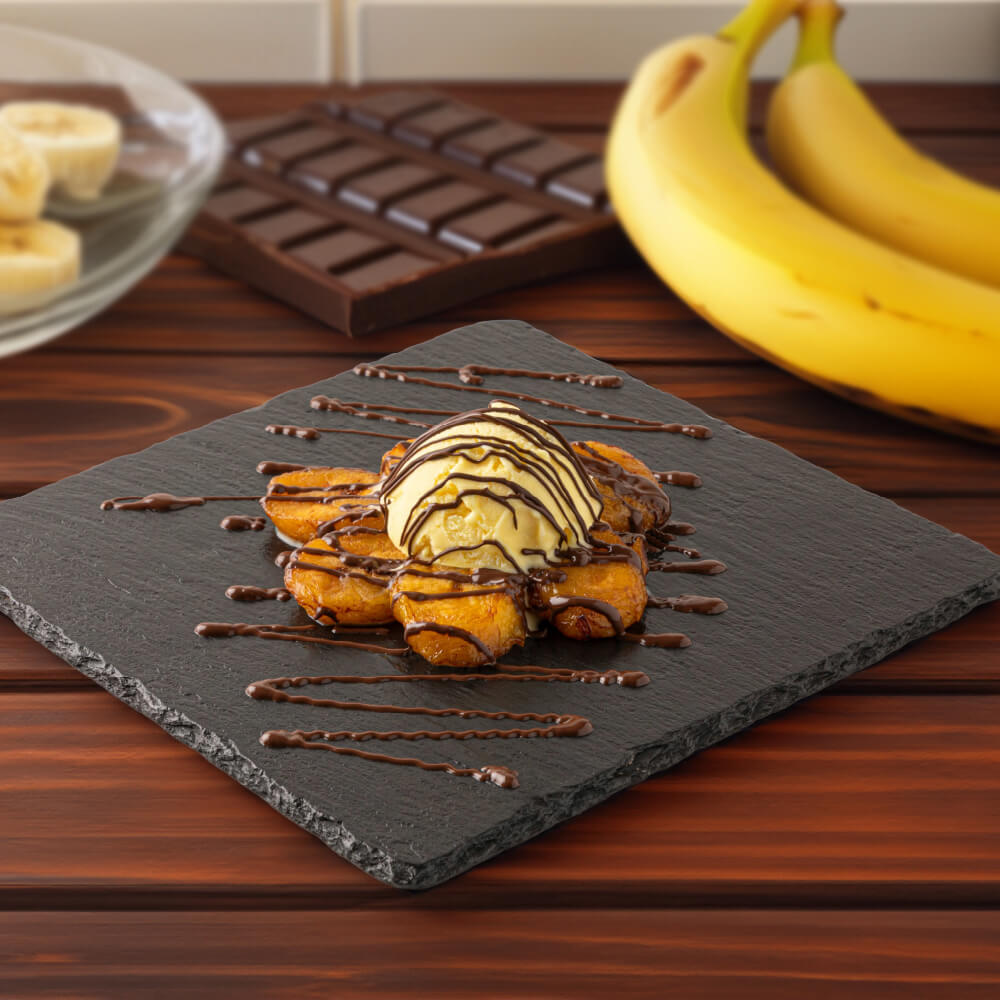 150 g. de plátano macho frito con 80 g. de helado de vainilla, chocolate o fresa. Bañados con chocolate, cajeta o leche condensada.