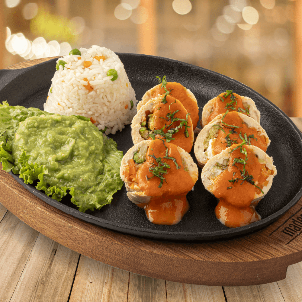 140 g. de pechuga de pollo, rellena de 30 g. de requesón, zanahoria, calabaza y brócoli, bañada en salsa de chile de árbol.